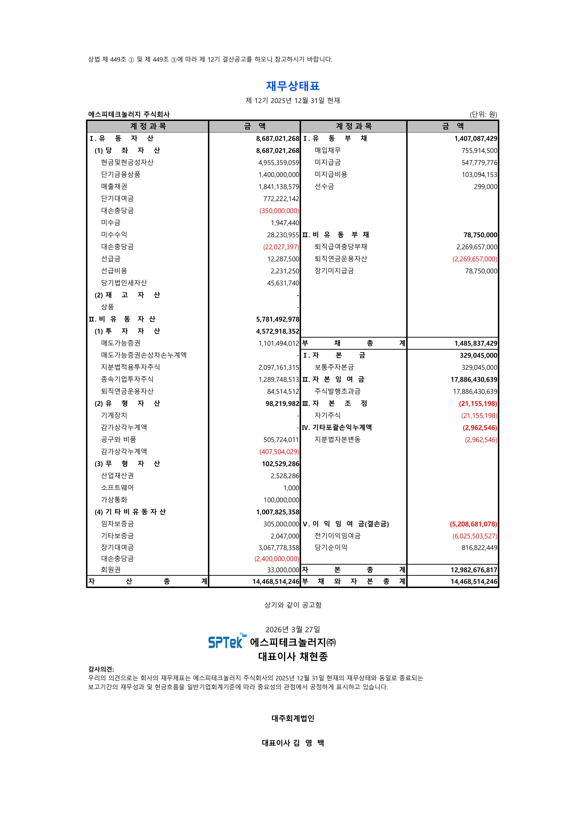 제12기 에스피테크놀러지 결산공고